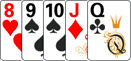 Straight Five cards in sequence. When more than one straight is competing, the one with the highest card wins. An ace can be taken as either high or low (but not both high and low in the same hand). |