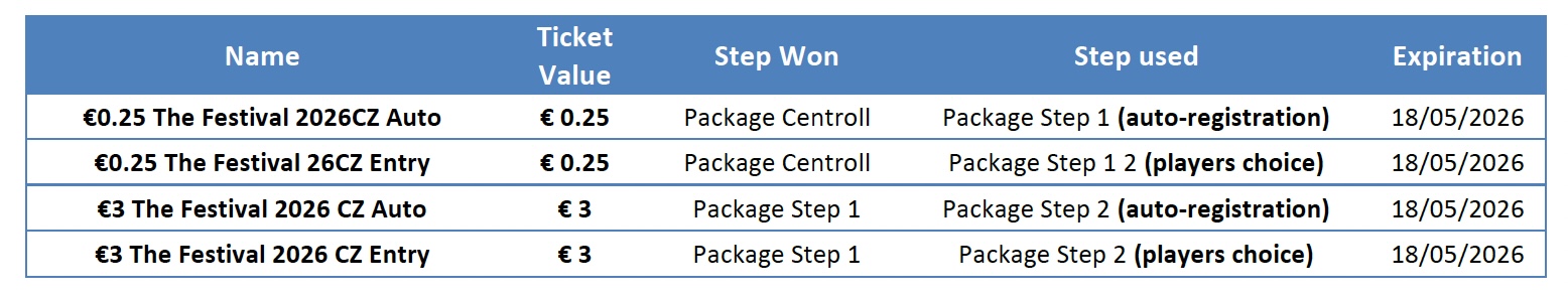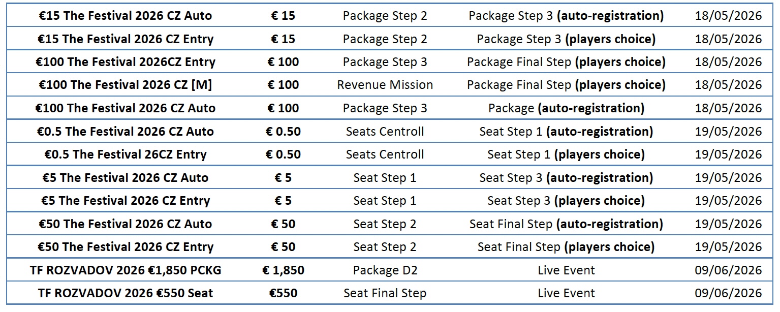 - Satellites will award “€XXX The Festival 2026 CZ Entry” tickets or “€XXX The Festival 2026 CZ Auto” auto registration entry tickets which can only be used in “The Festival in Rozvadov” Qualifiers related tournaments whilst the Promotion is in progress. The tickets will expire after the Promotion Period. “€XXX The Festival 2026 CZ Auto” auto registration entry tickets directly register players to the target event.
